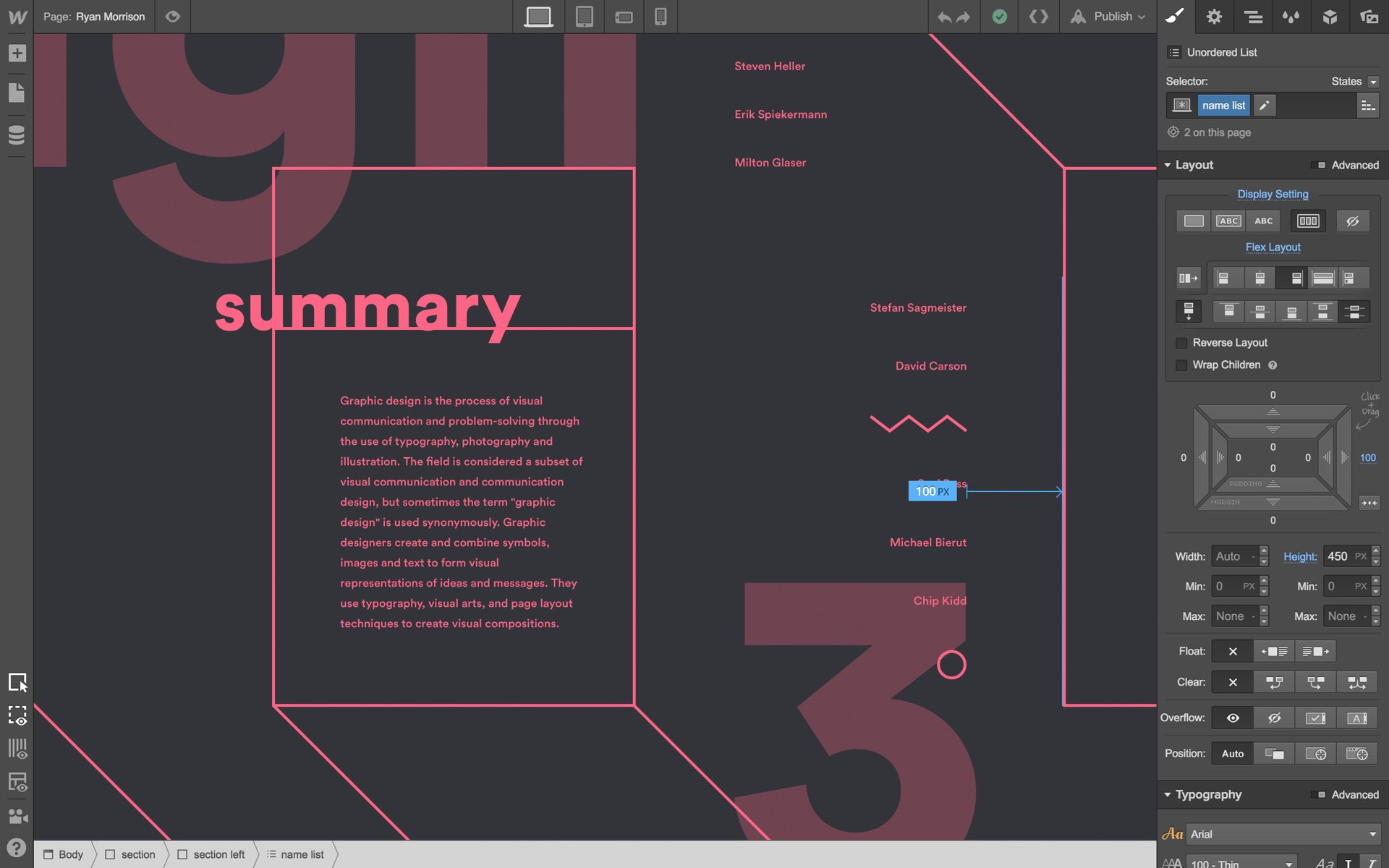 For starters, designers can specify layouts using the CSS box model, flexbox or floats, then add content and style it with media, colour and typography. Webflow also provides templates similar to Virb or Squarespace for those who don’t have a lot of time. Any element on the UI can be specified as a Symbol, and can be used repeatedly via CSS-like styling hooks.